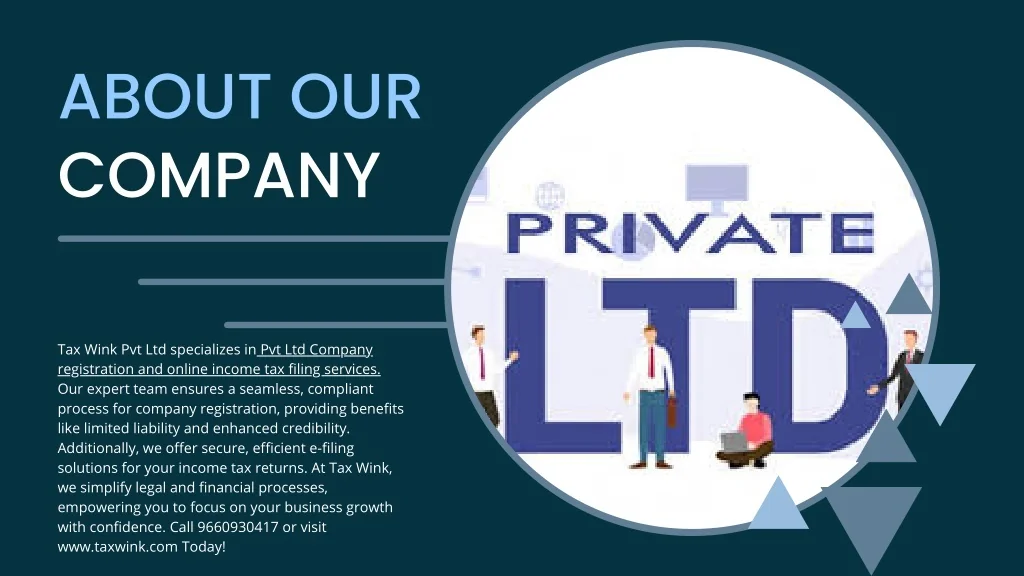 ABOUT OUR COMPANY Tax Wink Pvt Ltd specializes in Pvt Ltd Company registration and online income tax filing services. Our expert team ensures a seamless, compliant process for company registration, providing benefits like limited liability and enhanced credibility. Additionally, we offer secure, efficient e-filing solutions for your income tax returns. At Tax Wink, we simplify legal and financial processes, empowering you to focus on your business growth with confidence. Call 9660930417 or visit www.taxwink.com Today!