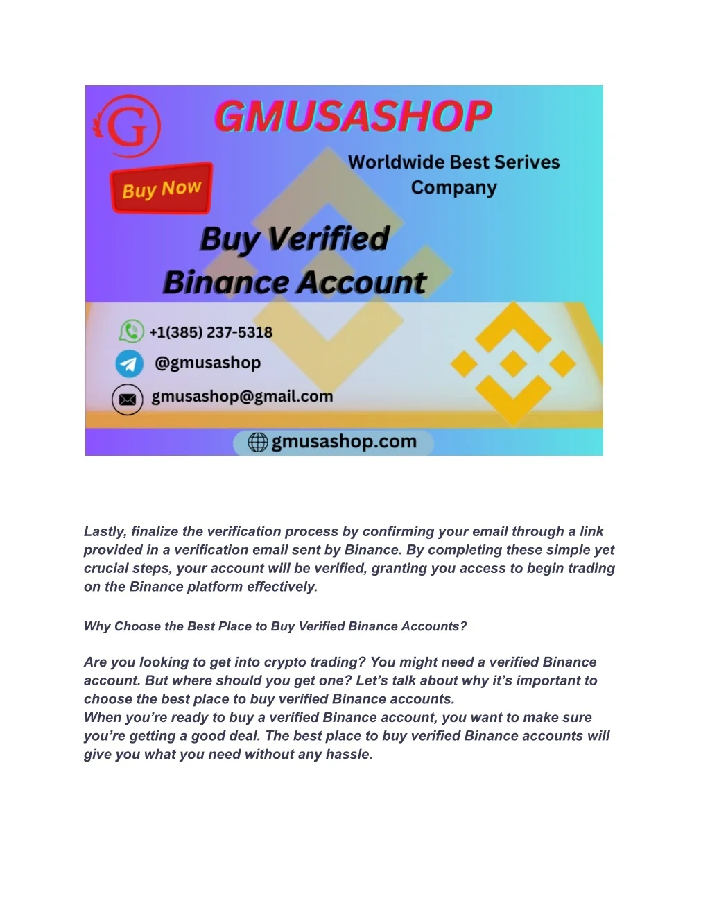 Contact Us / 24 Hours Reply Telegram: @gmusashop WhatsApp: +1 (385)237-5318 Email: gmusashop@gamil.com https://gmusashop.com/product/buy-verified-binance-account/ Buy Verified Binance Account If you run an online business, you might wonder why you should buy verified Binance account. Let’s look at why it’s important. First, when you buy a verified Binance account, you save time. Setting up and verifying a new account can take days or even weeks. But when you buy one that’s already verified, you can start using it right away. Security is another big reason to buy verified Binance account. These accounts have already passed Binance’s strict checks. This means they’re safer to use and less likely to get shut down. Trading limits are higher on verified accounts. When you buy a verified Binance account, you can trade more money at once. This is great if your business deals with large amounts. Some people buy verified Binance accounts to separate their business from their trades. It’s a smart way to organize your money. Lastly, when you buy a verified Binance account, you get access to all of Binance’s features right away. You don’t have to wait to use advanced tools that could help your business grow. If you want to save time, stay safe, trade more, and use all of Binance’s tools, you should think about buying a verified account. It’s a smart move for many online businesses. How to verify a Binance Accounts?