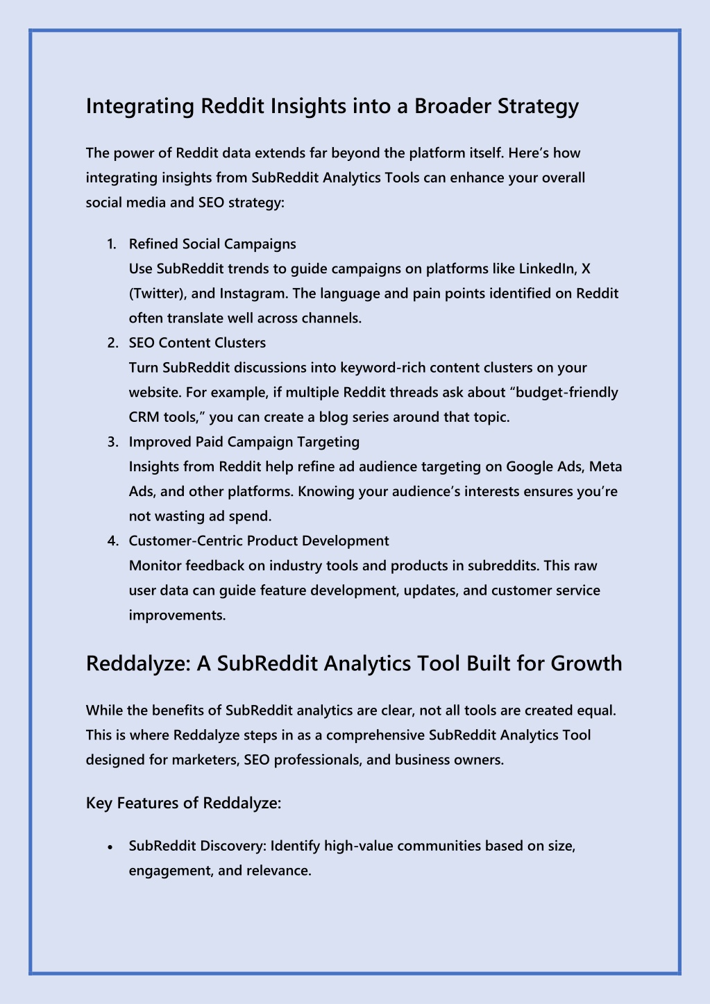 Integrating Reddit Insights into a Broader Strategy The power of Reddit data extends far beyond the platform itself. Here’s how integrating insights from SubReddit Analytics Tools can enhance your overall social media and SEO strategy: 1.Refined Social Campaigns Use SubReddit trends to guide campaigns on platforms like LinkedIn, X (Twitter), and Instagram. The language and pain points identified on Reddit often translate well across channels. 2.SEO Content Clusters Turn SubReddit discussions into keyword-rich content clusters on your website. For example, if multiple Reddit threads ask about “budget-friendly CRM tools,” you can create a blog series around that topic. 3.Improved Paid Campaign Targeting Insights from Reddit help refine ad audience targeting on Google Ads, Meta Ads, and other platforms. Knowing your audience’s interests ensures you’re not wasting ad spend. 4.Customer-Centric Product Development Monitor feedback on industry tools and products in subreddits. This raw user data can guide feature development, updates, and customer service improvements. Reddalyze: A SubReddit Analytics Tool Built for Growth While the benefits of SubReddit analytics are clear, not all tools are created equal. This is where Reddalyze steps in as a comprehensive SubReddit Analytics Tool designed for marketers, SEO professionals, and business owners. Key Features of Reddalyze: SubReddit Discovery: Identify high-value communities based on size, engagement, and relevance.