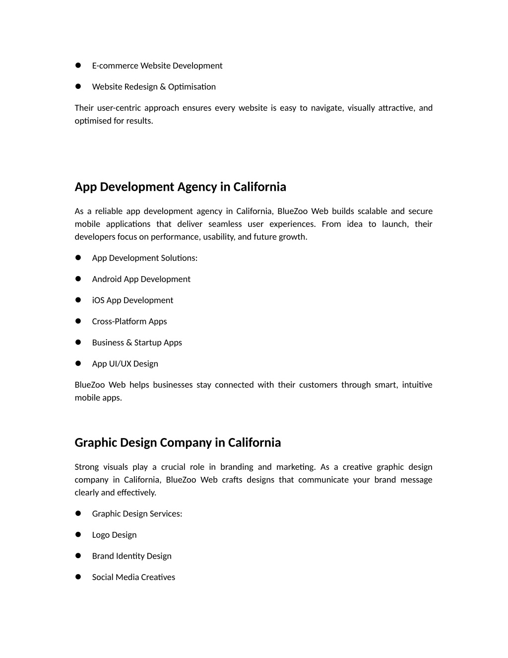 2. E-commerce Website Development  Website Redesign & Optimisation  Their user-centric approach ensures every website is easy to navigate, visually attractive, and optimised for results. App Development Agency in California As a reliable app development agency in California, BlueZoo Web builds scalable and secure mobile applications that deliver seamless user experiences. From idea to launch, their developers focus on performance, usability, and future growth. App Development Solutions:  Android App Development  iOS App Development  Cross-Platform Apps  Business & Startup Apps  App UI/UX Design  BlueZoo Web helps businesses stay connected with their customers through smart, intuitive mobile apps. Graphic Design Company in California Strong visuals play a crucial role in branding and marketing. As a creative graphic design company in California, BlueZoo Web crafts designs that communicate your brand message clearly and effectively. Graphic Design Services:  Logo Design  Brand Identity Design  Social Media Creatives 