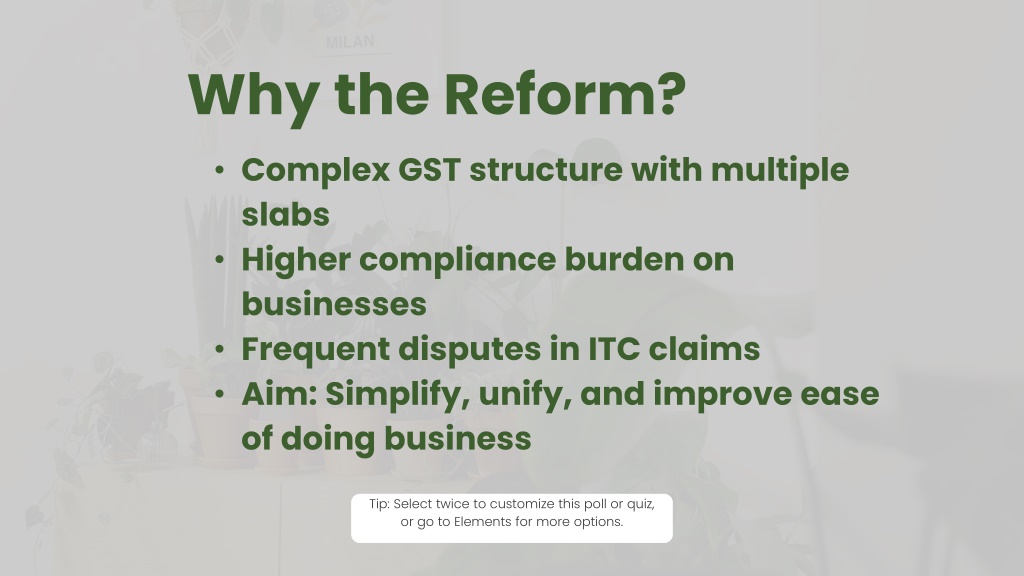 Tip: Select twice to customize this poll or quiz, or go to Elements for more options. Why the Reform? • Complex GST structure with multiple slabs • Higher compliance burden on businesses • Frequent disputes in ITC claims • Aim: Simplify, unify, and improve ease of doing business
