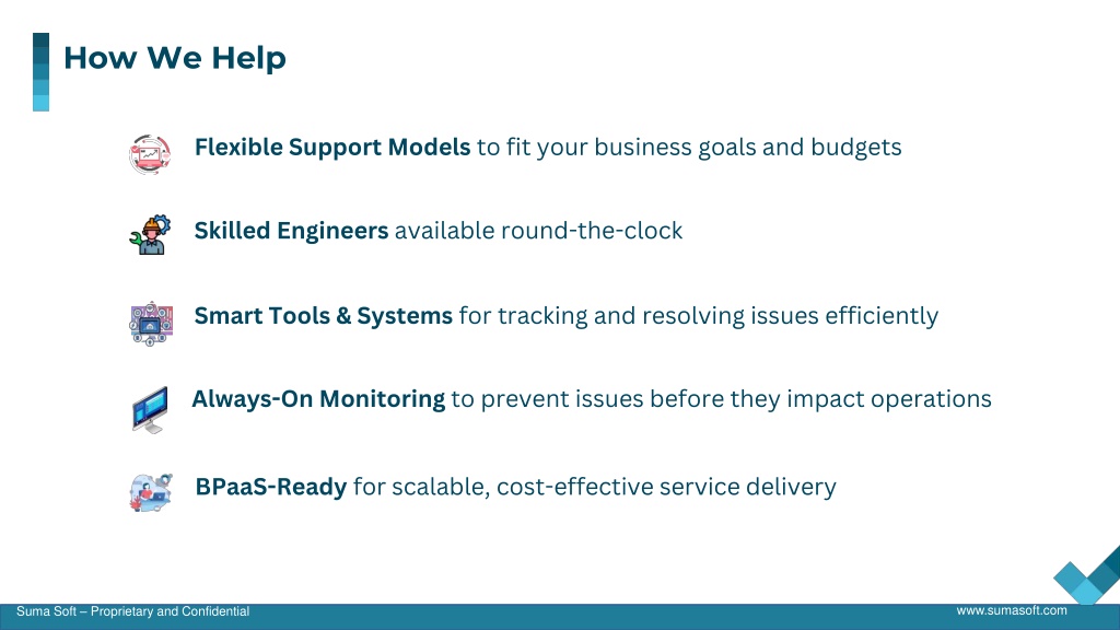How We Help Flexible Support Models to fit your business goals and budgets Skilled Engineers available round-the-clock Smart Tools & Systems for tracking and resolving issues efficiently Always-On Monitoring to prevent issues before they impact operations BPaaS-Ready for scalable, cost-effective service delivery www.sumasoft.com Suma Soft – Proprietary and Confidential
