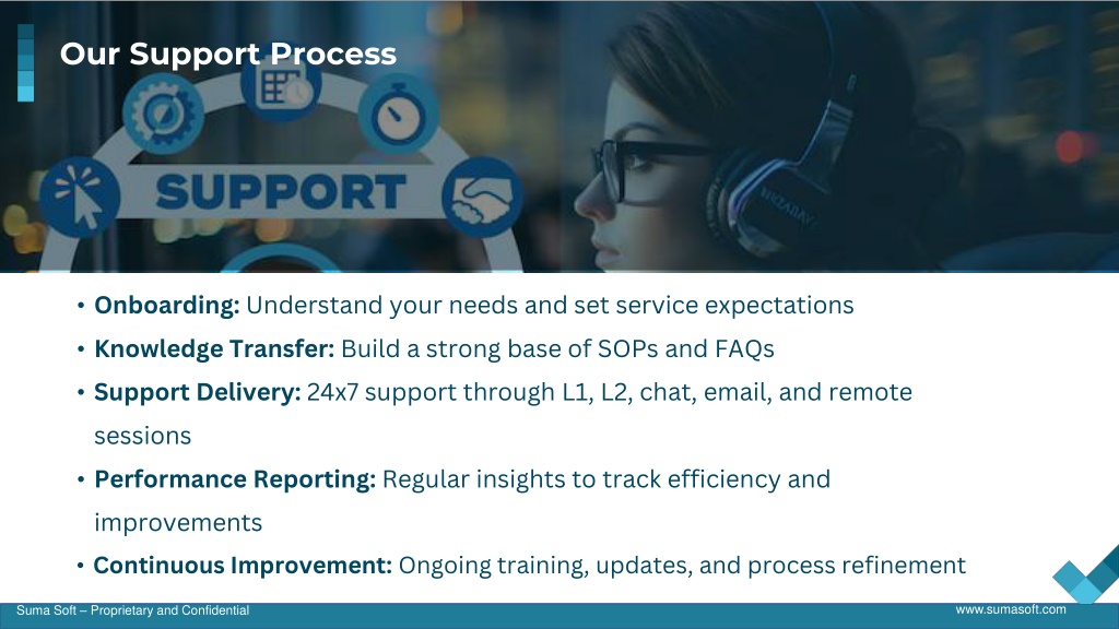 Our Support Process • Onboarding: Understand your needs and set service expectations • Knowledge Transfer: Build a strong base of SOPs and FAQs • Support Delivery: 24x7 support through L1, L2, chat, email, and remote sessions • Performance Reporting: Regular insights to track efficiency and improvements • Continuous Improvement: Ongoing training, updates, and process refinement www.sumasoft.com Suma Soft – Proprietary and Confidential
