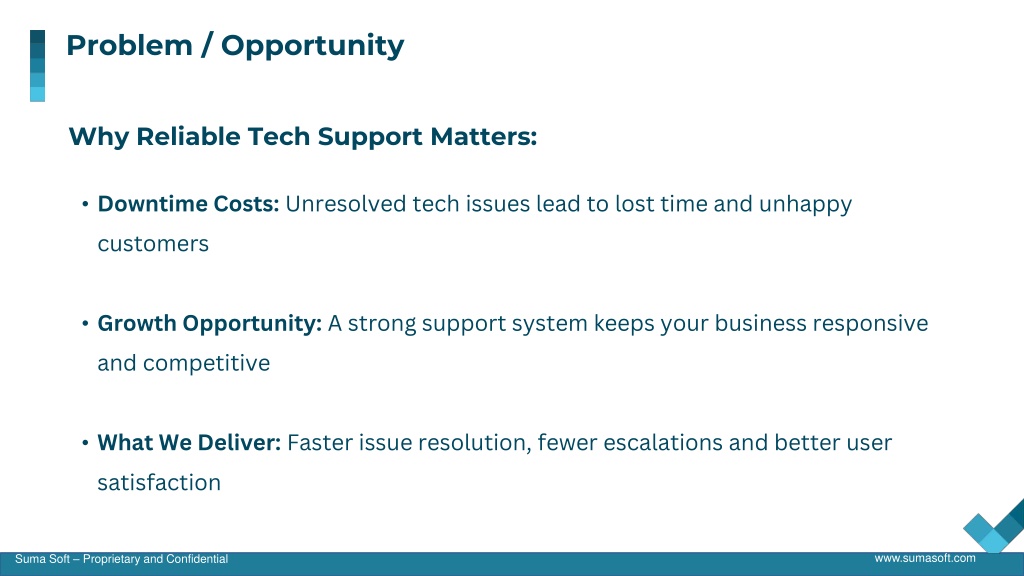 Problem / Opportunity Why Reliable Tech Support Matters: • Downtime Costs: Unresolved tech issues lead to lost time and unhappy customers • Growth Opportunity: A strong support system keeps your business responsive and competitive • What We Deliver: Faster issue resolution, fewer escalations and better user satisfaction www.sumasoft.com Suma Soft – Proprietary and Confidential
