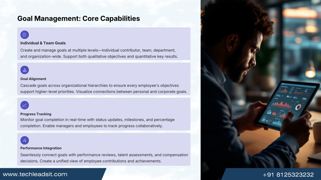 Goal Management: Core Capabilities Individual & Team Goals Create and manage goals at multiple levels—individual contributor, team, department, and organization-wide. Support both qualitative objectives and quantitative key results. Goal Alignment Cascade goals across organizational hierarchies to ensure every employee's objectives support higher-level priorities. Visualize connections between personal and corporate goals. Progress Tracking Monitor goal completion in real-time with status updates, milestones, and percentage completion. Enable managers and employees to track progress collaboratively. Performance Integration Seamlessly connect goals with performance reviews, talent assessments, and compensation decisions. Create a unified view of employee contributions and achievements. www.techleadsit.com +91 8125323232