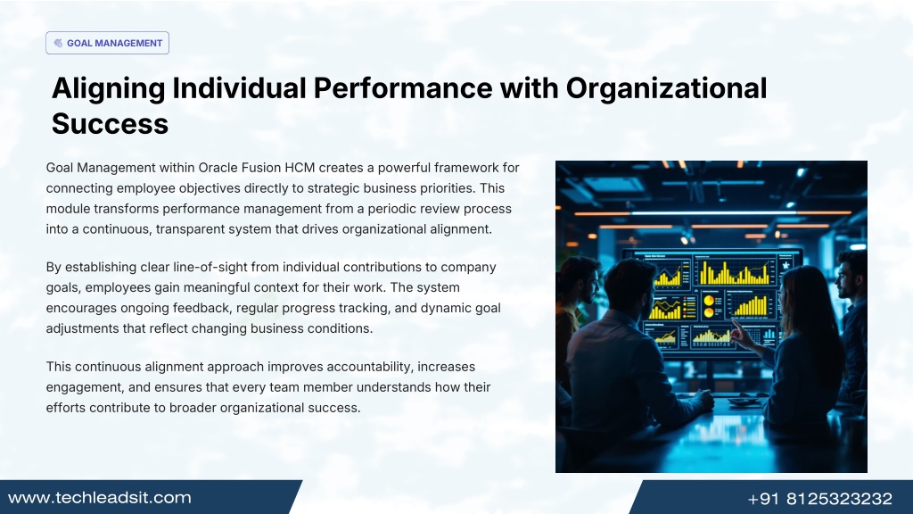 GOAL MANAGEMENT Aligning Individual Performance with Organizational Success Goal Management within Oracle Fusion HCM creates a powerful framework for connecting employee objectives directly to strategic business priorities. This module transforms performance management from a periodic review process into a continuous, transparent system that drives organizational alignment. By establishing clear line-of-sight from individual contributions to company goals, employees gain meaningful context for their work. The system encourages ongoing feedback, regular progress tracking, and dynamic goal adjustments that reflect changing business conditions. This continuous alignment approach improves accountability, increases engagement, and ensures that every team member understands how their efforts contribute to broader organizational success. www.techleadsit.com +91 8125323232