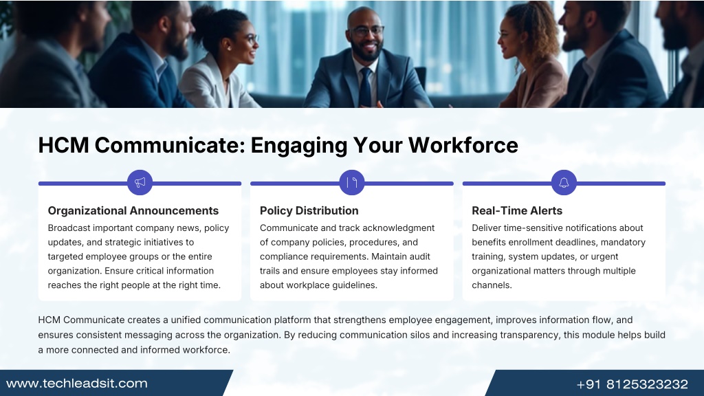 HCM Communicate: Engaging Your Workforce Organizational Announcements Policy Distribution Real-Time Alerts Broadcast important company news, policy updates, and strategic initiatives to targeted employee groups or the entire organization. Ensure critical information reaches the right people at the right time. Communicate and track acknowledgment of company policies, procedures, and compliance requirements. Maintain audit trails and ensure employees stay informed about workplace guidelines. Deliver time-sensitive notifications about benefits enrollment deadlines, mandatory training, system updates, or urgent organizational matters through multiple channels. HCM Communicate creates a unified communication platform that strengthens employee engagement, improves information flow, and ensures consistent messaging across the organization. By reducing communication silos and increasing transparency, this module helps build a more connected and informed workforce. www.techleadsit.com +91 8125323232