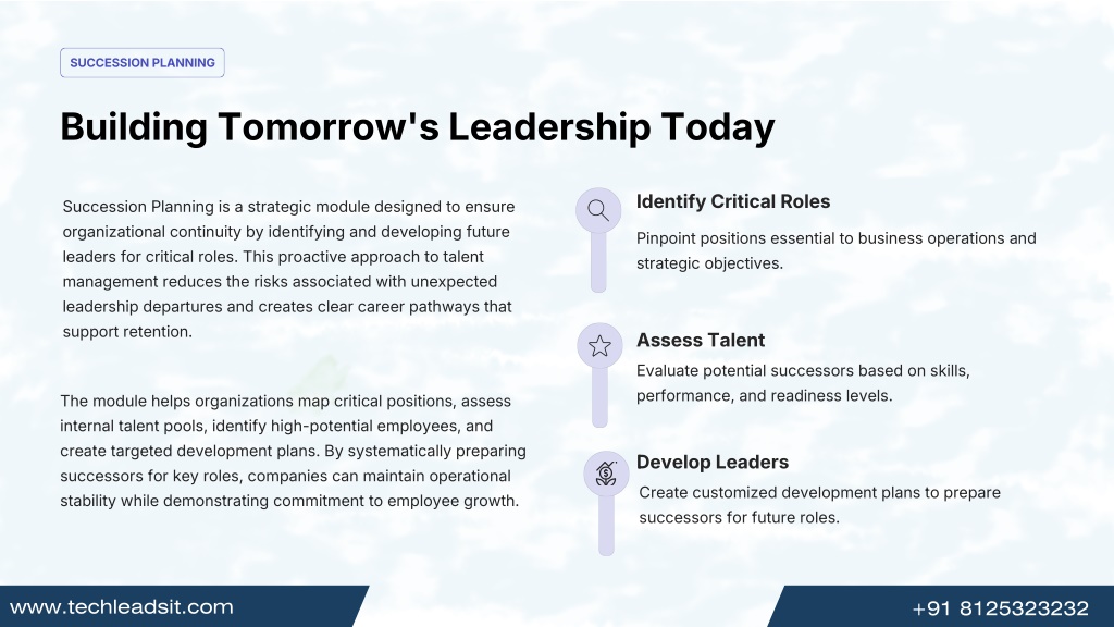 SUCCESSION PLANNING Building Tomorrow's Leadership Today Identify Critical Roles Succession Planning is a strategic module designed to ensure organizational continuity by identifying and developing future leaders for critical roles. This proactive approach to talent management reduces the risks associated with unexpected leadership departures and creates clear career pathways that support retention. Pinpoint positions essential to business operations and strategic objectives. Assess Talent Evaluate potential successors based on skills, performance, and readiness levels. The module helps organizations map critical positions, assess internal talent pools, identify high-potential employees, and create targeted development plans. By systematically preparing successors for key roles, companies can maintain operational stability while demonstrating commitment to employee growth. Develop Leaders Create customized development plans to prepare successors for future roles. www.techleadsit.com +91 8125323232