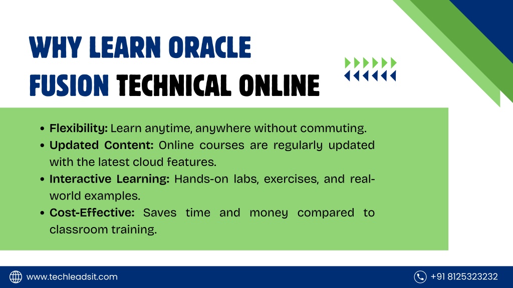 7. WHY ORACLE FUSION TECHNICAL SKILLS WILL LAST oracle fusion technical training skills are in high demand as companies move to cloud-based systems. These skills help manage data, build reports, customize apps, and integrate systems efficiently. They are versatile and useful across industries like HR, finance, and supply chain. Oracle keeps updating Fusion with new features and tools for modern business needs. Learning these skills ensures a future-proof career with long-term growth opportunities. +91 8125323232 www.techleadsit.com
