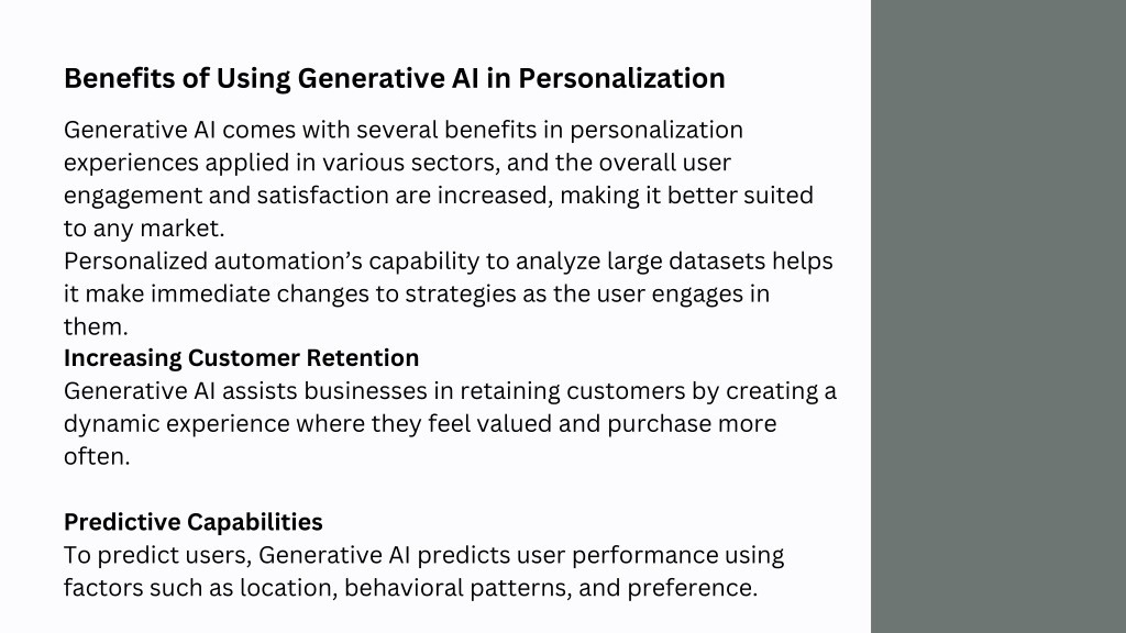 Benefits of Using Generative AI in Personalization Generative AI comes with several benefits in personalization experiences applied in various sectors, and the overall user engagement and satisfaction are increased, making it better suited to any market. Personalized automation’s capability to analyze large datasets helps it make immediate changes to strategies as the user engages in them. Increasing Customer Retention Generative AI assists businesses in retaining customers by creating a dynamic experience where they feel valued and purchase more often. Predictive Capabilities To predict users, Generative AI predicts user performance using factors such as location, behavioral patterns, and preference.