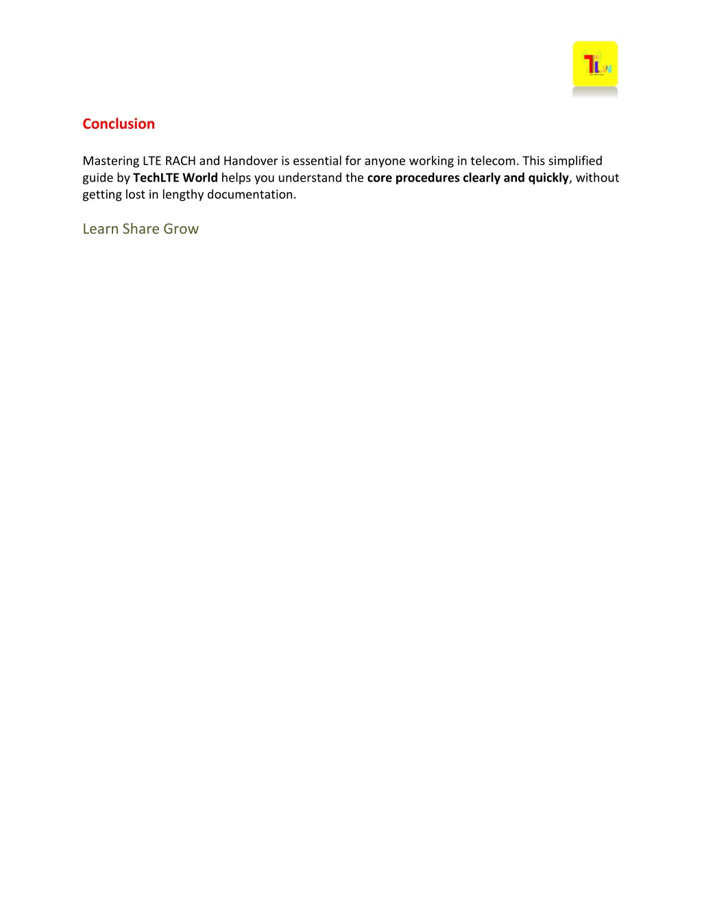 Conclusion Mastering LTE RACH and Handover is essential for anyone working in telecom. This simplified guide by TechLTE World helps you understand the core procedures clearly and quickly, without getting lost in lengthy documentation. Learn Share Grow