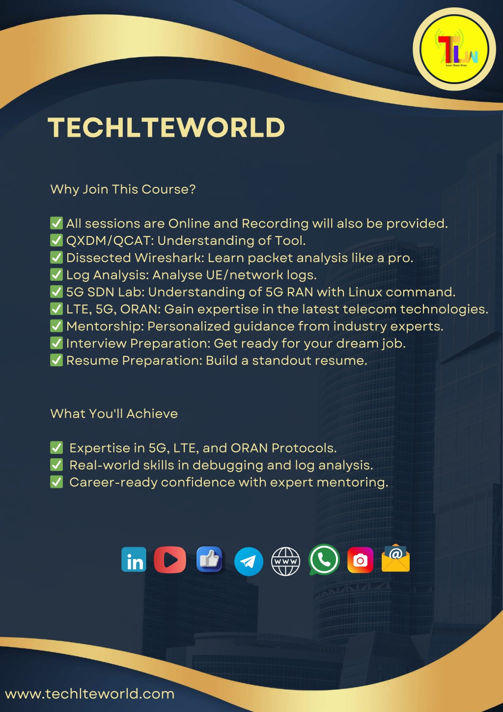 TECHLTEWORLD Why Join This Course? ✅ All sessions are Online and Recording will also be provided. ✅ QXDM/QCAT: Understanding of Tool. ✅ Dissected Wireshark: Learn packet analysis like a pro. ✅ Log Analysis: Analyse UE/network logs. ✅ 5G SDN Lab: Understanding of 5G RAN with Linux command. ✅ LTE, 5G, ORAN: Gain expertise in the latest telecom technologies. ✅ Mentorship: Personalized guidance from industry experts. ✅ Interview Preparation: Get ready for your dream job. ✅ Resume Preparation: Build a standout resume. What You'll Achieve ✅ Expertise in 5G, LTE, and ORAN Protocols. ✅ Real-world skills in debugging and log analysis. ✅ Career-ready confidence with expert mentoring. www.techlteworld.com