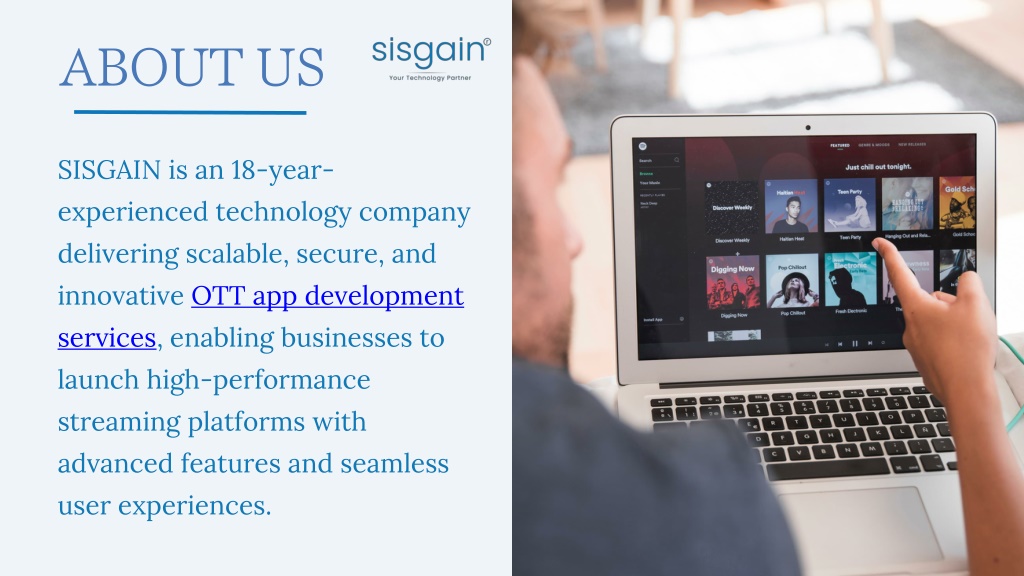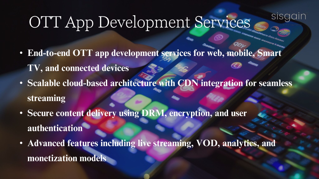 ABOUT US SISGAIN is an 18-year-experienced technology company delivering scalable, secure, and innovative OTT app development services, enabling businesses to launch high-performance streaming platforms with advanced features and seamless user experiences.