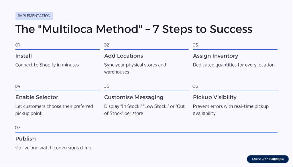 IMPLEMENTATION The "Multiloca Method" – 7 Steps to Success 01 02 03 Install Add Locations Assign Inventory Connect to Shopify in minutes Sync your physical stores and warehouses Dedicated quantities for every location 04 05 06 Enable Selector Customise Messaging Pickup Visibility Let customers choose their preferred pickup point Display "In Stock," "Low Stock," or "Out of Stock" per store Prevent errors with real-time pickup availability 07 Publish Go live and watch conversions climb