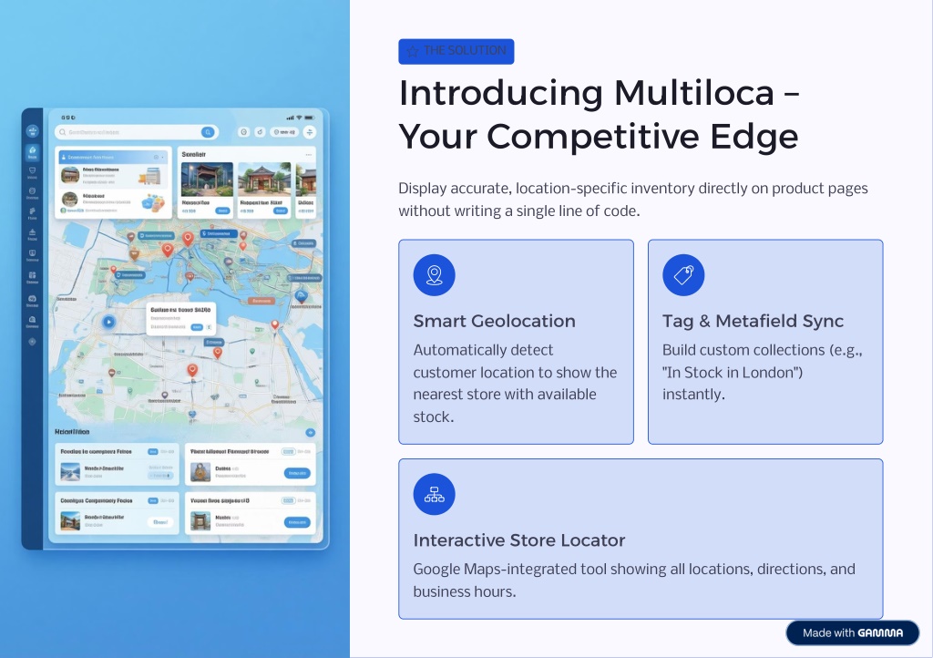 THE SOLUTION Introducing Multiloca – Your Competitive Edge Display accurate, location-specific inventory directly on product pages without writing a single line of code. Smart Geolocation Tag & Metafield Sync Automatically detect customer location to show the nearest store with available stock. Build custom collections (e.g., "In Stock in London") instantly. Interactive Store Locator Google Maps-integrated tool showing all locations, directions, and business hours.