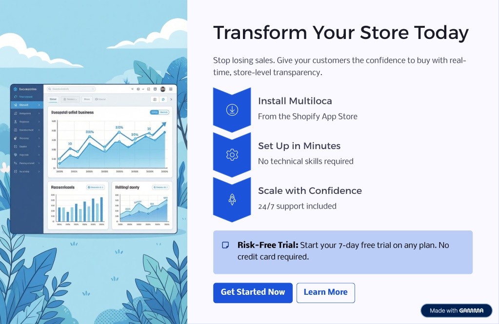 Transform Your Store Today Stop losing sales. Give your customers the confidence to buy with real- time, store-level transparency. Install Multiloca From the Shopify App Store Set Up in Minutes No technical skills required Scale with Confidence 24/7 support included Risk-Free Trial: Start your 7-day free trial on any plan. No credit card required. Get Started Now Learn More
