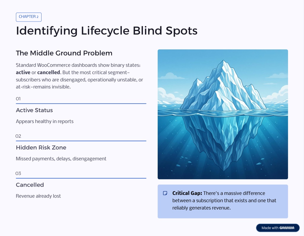 5. CHAPTER 2 Identifying Lifecycle Blind Spots The Middle Ground Problem Standard WooCommerce dashboards show binary states: active or cancelled. But the most critical segment— subscribers who are disengaged, operationally unstable, or at-risk—remains invisible. 01 Active Status Appears healthy in reports 02 Hidden Risk Zone Missed payments, delays, disengagement 03 Cancelled Critical Gap: There's a massive difference between a subscription that exists and one that reliably generates revenue. Revenue already lost