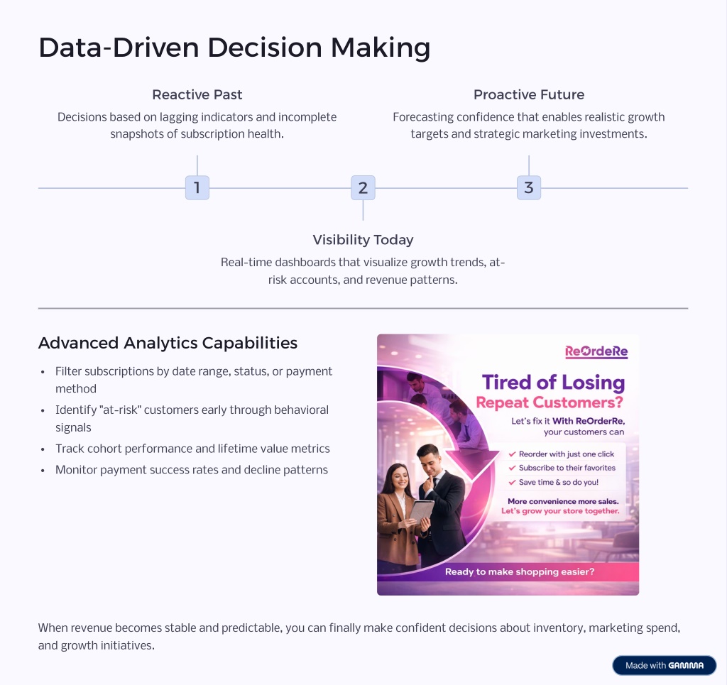 6. The Real Cost of Revenue Instability Inventory Planning Cash Flow Forecasting Unpredictable renewals make it impossible to accurately forecast demand, leading to overstock or stockouts and wasted capital. When you can't rely on recurring revenue, financial planning becomes guesswork, affecting supplier payments and operational decisions. Marketing Confidence Support Workload Unstable revenue forces conservative marketing budgets, limiting growth potential and customer acquisition opportunities. Billing confusion and failed payments create support tickets, draining team resources that could be focused on growth initiatives. The Scaling Paradox: Businesses often stall not from lack of demand, but because their revenue foundation is too fragile to support expansion. Growth requires stability first.