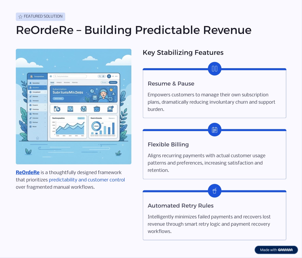 10. Ready to Build Predictable Revenue? 3x 40% 24/7 Revenue Stability Churn Reduction Support Available Customers report 3x improvement in revenue predictability within 90 days Average decrease in involuntary churn through customer control features Expert assistance whenever you need guidance or technical help Predictability is Designed, Not Accidental Reliable recurring revenue isn't a matter of luck—it's the outcome of intentional system design. Replace fragmented tools with a cohesive system that eliminates blind spots and builds confidence. Download For Free Schedule a Demo Transform your subscription business today. When revenue is stable, you can scale with confidence, invest strategically, and focus on growth instead of firefighting.