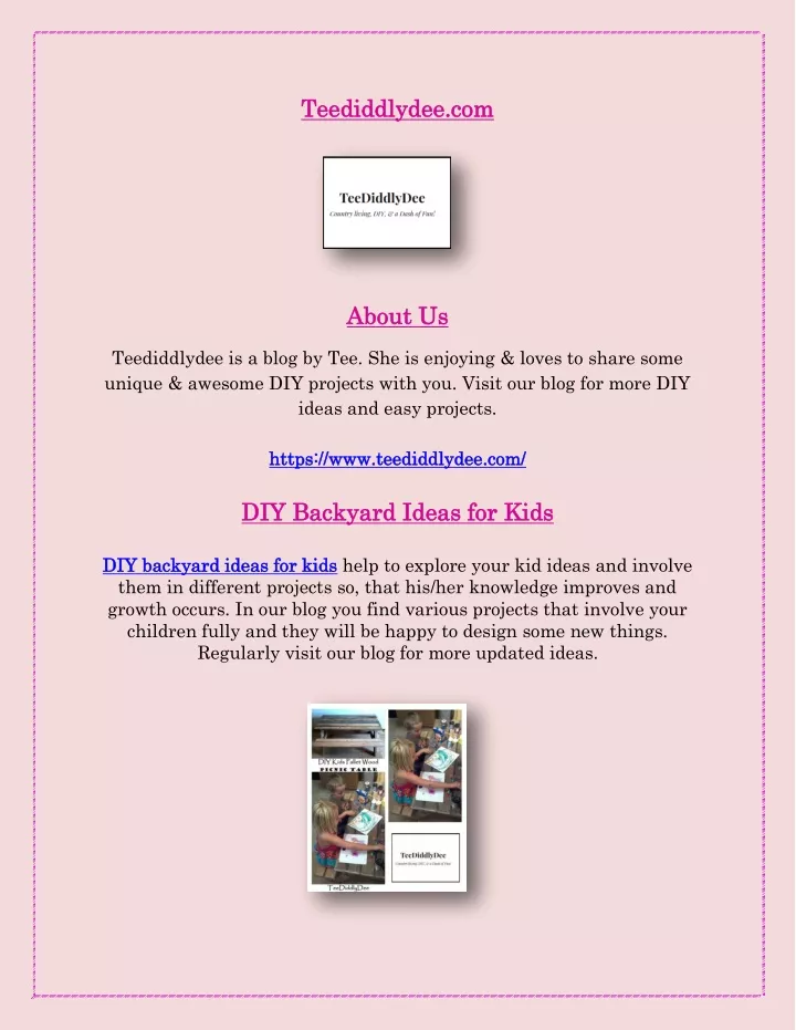 Tee Teedid didd dlydee. lydee.com com A About U bout Us s Teediddlydee is a blog by Tee. She is enjoying & loves to share some unique & awesome DIY projects with you. Visit our blog for more DIY ideas and easy projects. h ht tt tps: ps:/ // /w www. ww.t te ee edid DIY DIY Backy Backyard Ide ard Ideas DI DIY Y back backyard yard id ide ea as fo s for r k kids ids help to explore your kid ideas and involve them in different projects so, that his/her knowledge improves and growth occurs. In our blog you find various projects that involve your children fully and they will be happy to design some new things. Regularly visit our blog for more updated ideas. diddlyde dlydee e. .c co om m/ / as for for K Kids ids