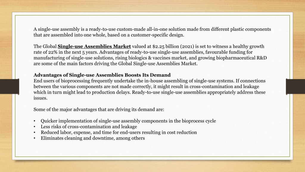 A single-use assembly is a ready-to-use custom-made all-in-one solution made from different plastic components that are assembled into one whole, based on a customer-specific design. • The Global Single-use Assemblies Market valued at $2.25 billion (2021) is set to witness a healthy growth rate of 22% in the next 5 years. Advantages of ready-to-use single-use assemblies, favourable funding for manufacturing of single-use solutions, rising biologics & vaccines market, and growing biopharmaceutical R&D are some of the main factors driving the Global Single-use Assemblies Market. • Advantages of Single-use Assemblies Boosts Its Demand • End users of bioprocessing frequently undertake the in-house assembling of single-use systems. If connections between the various components are not made correctly, it might result in cross-contamination and leakage which in turn might lead to production delays. Ready-to-use single-use assemblies appropriately address these issues. • Some of the major advantages that are driving its demand are: • Quicker implementation of single-use assembly components in the bioprocess cycle • Less risks of cross-contamination and leakage • Reduced labor, expense, and time for end-users resulting in cost reduction • Eliminates cleaning and downtime, among others