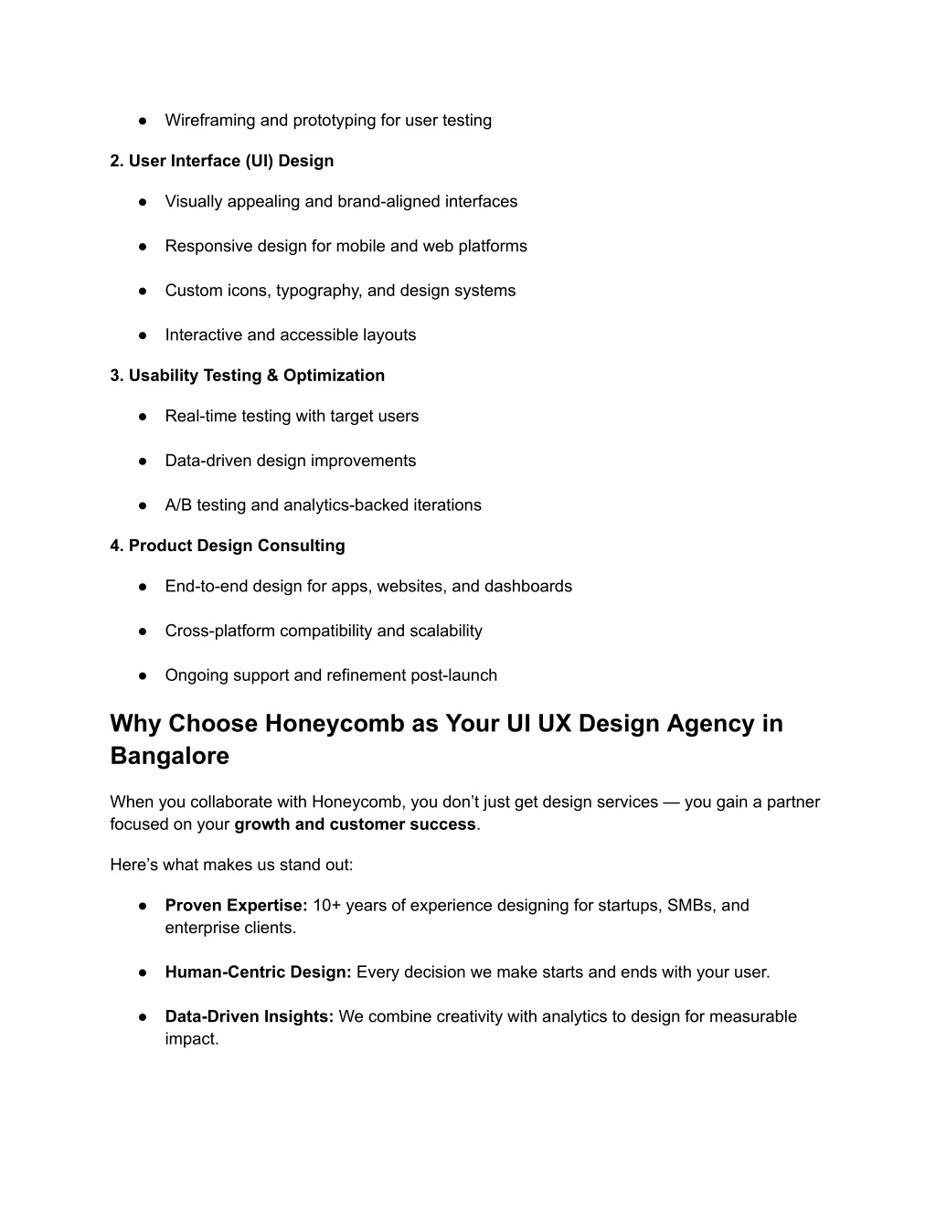 3. ● Wireframing and prototyping for user testing 2. User Interface (UI) Design ● Visually appealing and brand-aligned interfaces ● Responsive design for mobile and web platforms ● Custom icons, typography, and design systems ● Interactive and accessible layouts 3. Usability Testing & Optimization ● Real-time testing with target users ● Data-driven design improvements ● A/B testing and analytics-backed iterations 4. Product Design Consulting ● End-to-end design for apps, websites, and dashboards ● Cross-platform compatibility and scalability ● Ongoing support and refinement post-launch Why Choose Honeycomb as Your UI UX Design Agency in Bangalore When you collaborate with Honeycomb, you don’t just get design services — you gain a partner focused on your growth and customer success. Here’s what makes us stand out: ● Proven Expertise: 10+ years of experience designing for startups, SMBs, and enterprise clients. ● Human-Centric Design: Every decision we make starts and ends with your user. ● Data-Driven Insights: We combine creativity with analytics to design for measurable impact.