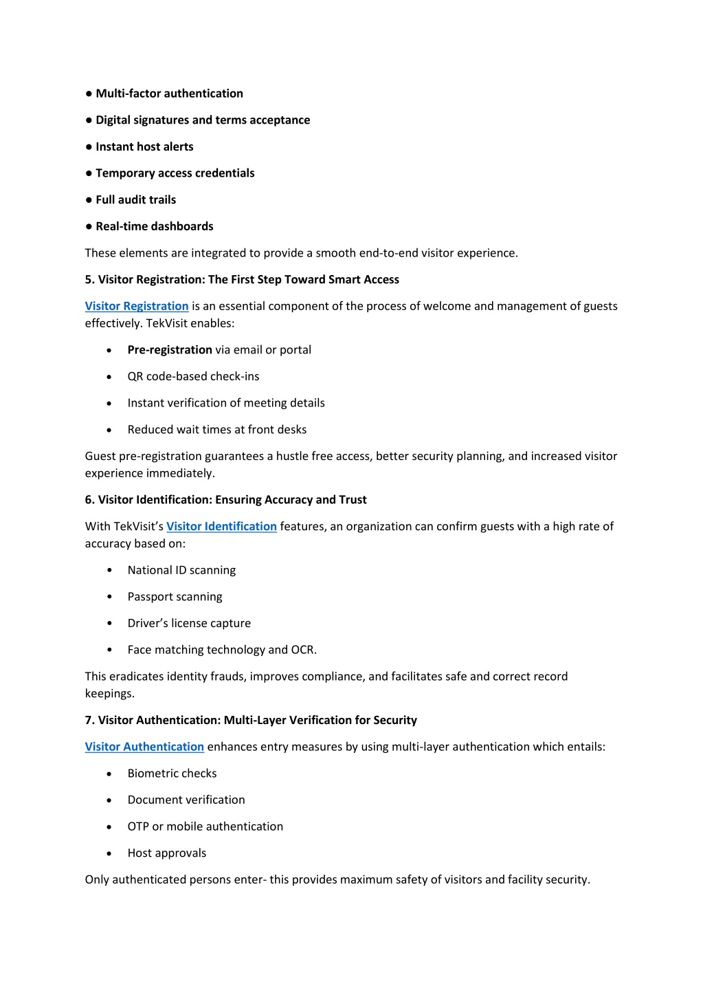 ● Multi-factor authentication ● Digital signatures and terms acceptance ● Instant host alerts ● Temporary access credentials ● Full audit trails ● Real-time dashboards These elements are integrated to provide a smooth end-to-end visitor experience. 5. Visitor Registration: The First Step Toward Smart Access Visitor Registration is an essential component of the process of welcome and management of guests effectively. TekVisit enables: • Pre-registration via email or portal • QR code-based check-ins • Instant verification of meeting details • Reduced wait times at front desks Guest pre-registration guarantees a hustle free access, better security planning, and increased visitor experience immediately. 6. Visitor Identification: Ensuring Accuracy and Trust With TekVisit’s Visitor Identification features, an organization can confirm guests with a high rate of accuracy based on: •National ID scanning •Passport scanning •Driver’s license capture •Face matching technology and OCR. This eradicates identity frauds, improves compliance, and facilitates safe and correct record keepings. 7. Visitor Authentication: Multi-Layer Verification for Security Visitor Authentication enhances entry measures by using multi-layer authentication which entails: • Biometric checks • Document verification • OTP or mobile authentication • Host approvals Only authenticated persons enter- this provides maximum safety of visitors and facility security.