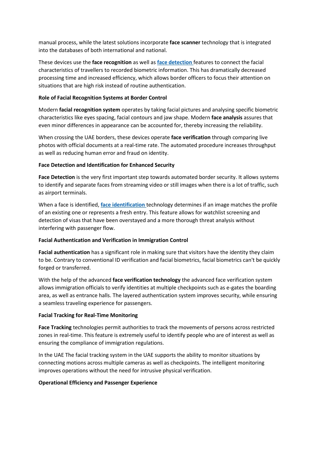 manual process, while the latest solutions incorporate face scanner technology that is integrated into the databases of both international and national. These devices use the face recognition as well as face detection features to connect the facial characteristics of travellers to recorded biometric information. This has dramatically decreased processing time and increased efficiency, which allows border officers to focus their attention on situations that are high risk instead of routine authentication. Role of Facial Recognition Systems at Border Control Modern facial recognition system operates by taking facial pictures and analysing specific biometric characteristics like eyes spacing, facial contours and jaw shape. Modern face analysis assures that even minor differences in appearance can be accounted for, thereby increasing the reliability. When crossing the UAE borders, these devices operate face verification through comparing live photos with official documents at a real-time rate. The automated procedure increases throughput as well as reducing human error and fraud on identity. Face Detection and Identification for Enhanced Security Face Detection is the very first important step towards automated border security. It allows systems to identify and separate faces from streaming video or still images when there is a lot of traffic, such as airport terminals. When a face is identified, face identification technology determines if an image matches the profile of an existing one or represents a fresh entry. This feature allows for watchlist screening and detection of visas that have been overstayed and a more thorough threat analysis without interfering with passenger flow. Facial Authentication and Verification in Immigration Control Facial authentication has a significant role in making sure that visitors have the identity they claim to be. Contrary to conventional ID verification and facial biometrics, facial biometrics can't be quickly forged or transferred. With the help of the advanced face verification technology the advanced face verification system allows immigration officials to verify identities at multiple checkpoints such as e-gates the boarding area, as well as entrance halls. The layered authentication system improves security, while ensuring a seamless traveling experience for passengers. Facial Tracking for Real-Time Monitoring Face Tracking technologies permit authorities to track the movements of persons across restricted zones in real-time. This feature is extremely useful to identify people who are of interest as well as ensuring the compliance of immigration regulations. In the UAE The facial tracking system in the UAE supports the ability to monitor situations by connecting motions across multiple cameras as well as checkpoints. The intelligent monitoring improves operations without the need for intrusive physical verification. Operational Efficiency and Passenger Experience