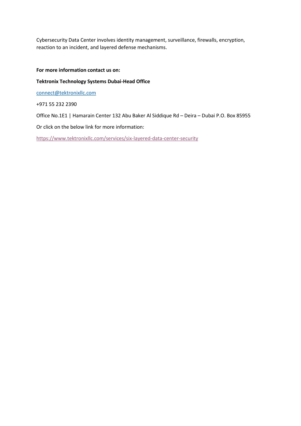 Cybersecurity Data Center involves identity management, surveillance, firewalls, encryption, reaction to an incident, and layered defense mechanisms. For more information contact us on: Tektronix Technology Systems Dubai-Head Office connect@tektronixllc.com +971 55 232 2390 Office No.1E1 | Hamarain Center 132 Abu Baker Al Siddique Rd – Deira – Dubai P.O. Box 85955 Or click on the below link for more information: https://www.tektronixllc.com/services/six-layered-data-center-security