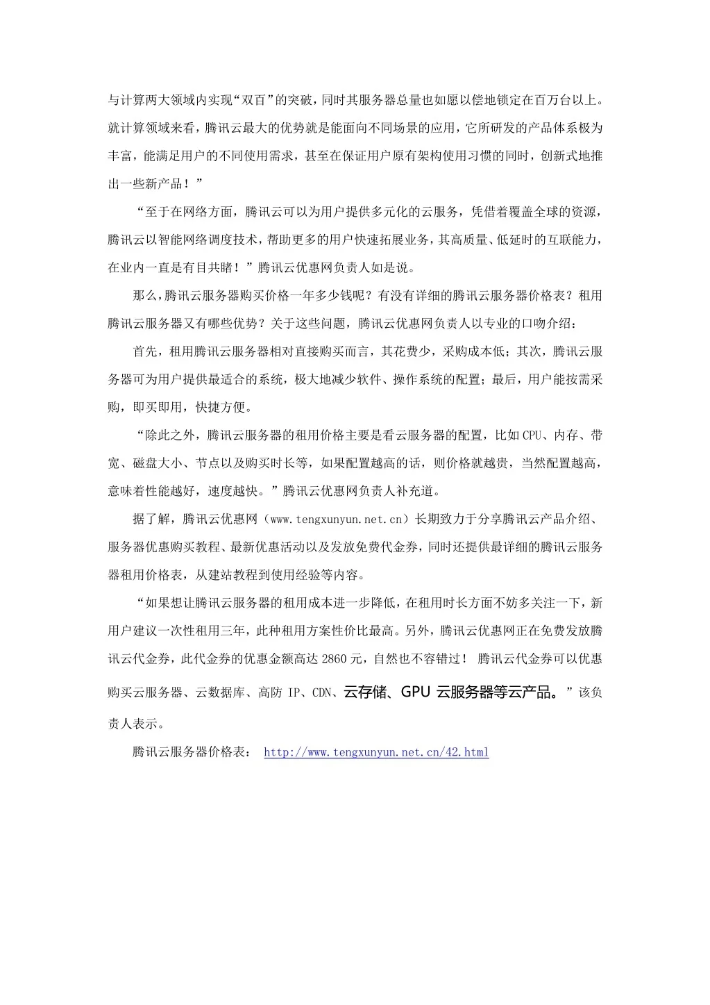 与计算两大领域内实现 “双百” 的突破, 同时其服务器总量也如愿以偿地锁定在百万台以上。 就计算领域来看, 腾讯云最大的优势就是能面向不同场景的应用, 它所研发的产品体系极为 丰富,能满足用户的不同使用需求,甚至在保证用户原有架构使用习惯的同时,创新式地推 出一些新产品!” “至于在网络方面,腾讯云可以为用户提供多元化的云服务,凭借着覆盖全球的资源, 腾讯云以智能网络调度技术, 帮助更多的用户快速拓展业务, 其高质量、 低延时的互联能力, 在业内一直是有目共睹!”腾讯云优惠网负责人如是说。 那么, 腾讯云服务器购买价格一年多少钱呢?有没有详细的腾讯云服务器价格表?租用 腾讯云服务器又有哪些优势?关于这些问题,腾讯云优惠网负责人以专业的口吻介绍: 首先,租用腾讯云服务器相对直接购买而言,其花费少,采购成本低;其次,腾讯云服 务器可为用户提供最适合的系统,极大地减少软件、操作系统的配置;最后,用户能按需采 购,即买即用,快捷方便。 “除此之外,腾讯云服务器的租用价格主要是看云服务器的配置,比如 CPU、内存、带 宽、磁盘大小、节点以及购买时长等,如果配置越高的话,则价格就越贵,当然配置越高, 意味着性能越好,速度越快。”腾讯云优惠网负责人补充道。 据了解,腾讯云优惠网(www.tengxunyun.net.cn)长期致力于分享腾讯云产品介绍、 服务器优惠购买教程、 最新优惠活动以及发放免费代金券, 同时还提供最详细的腾讯云服务 器租用价格表,从建站教程到使用经验等内容。 “如果想让腾讯云服务器的租用成本进一步降低, 在租用时长方面不妨多关注一下, 新 用户建议一次性租用三年,此种租用方案性价比最高。另外,腾讯云优惠网正在免费发放腾 讯云代金券,此代金券的优惠金额高达 2860 元,自然也不容错过!腾讯云代金券可以优惠 购买云服务器、云数据库、高防 IP、CDN、云存储、GPU 云服务器等云产品。”该负 责人表示。 腾讯云服务器价格表: http://www.tengxunyun.net.cn/42.html