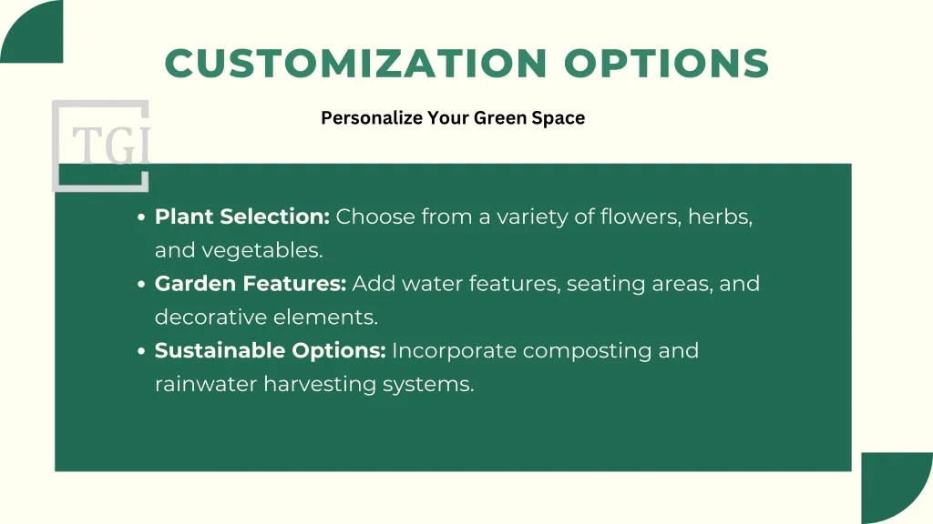 CUSTOMIZATION OPTIONS Personalize Your Green Space Plant Selection: Choose from a variety of flowers, herbs, and vegetables. Garden Features: Add water features, seating areas, and decorative elements. Sustainable Options: Incorporate composting and rainwater harvesting systems.