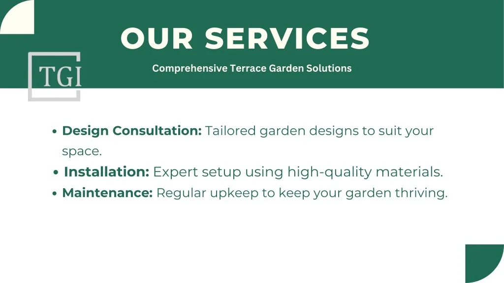 OUR SERVICES Comprehensive Terrace Garden Solutions Design Consultation: Tailored garden designs to suit your space. Installation: Expert setup using high-quality materials. Maintenance: Regular upkeep to keep your garden thriving.