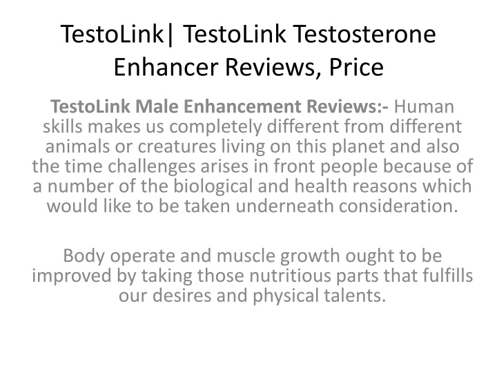 TestoLink| TestoLink Testosterone Enhancer Reviews, Price TestoLink Male Enhancement Reviews:- Human skills makes us completely different from different animals or creatures living on this planet and also the time challenges arises in front people because of a number of the biological and health reasons which would like to be taken underneath consideration. Body operate and muscle growth ought to be improved by taking those nutritious parts that fulfills our desires and physical talents.
