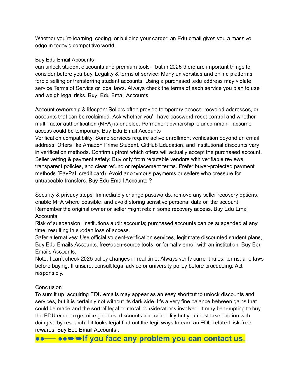 Whether you’re learning, coding, or building your career, an Edu email gives you a massive edge in today’s competitive world. Buy Edu Email Accounts can unlock student discounts and premium tools—but in 2025 there are important things to consider before you buy. Legality & terms of service: Many universities and online platforms forbid selling or transferring student accounts. Using a purchased .edu address may violate service Terms of Service or local laws. Always check the terms of each service you plan to use and weigh legal risks. Buy Edu Email Accounts Account ownership & lifespan: Sellers often provide temporary access, recycled addresses, or accounts that can be reclaimed. Ask whether you’ll have password-reset control and whether multi-factor authentication (MFA) is enabled. Permanent ownership is uncommon—assume access could be temporary. Buy Edu Email Accounts Verification compatibility: Some services require active enrollment verification beyond an email address. Offers like Amazon Prime Student, GitHub Education, and institutional discounts vary in verification methods. Confirm upfront which offers will actually accept the purchased account. Seller vetting & payment safety: Buy only from reputable vendors with verifiable reviews, transparent policies, and clear refund or replacement terms. Prefer buyer-protected payment methods (PayPal, credit card). Avoid anonymous payments or sellers who pressure for untraceable transfers. Buy Edu Email Accounts ? Security & privacy steps: Immediately change passwords, remove any seller recovery options, enable MFA where possible, and avoid storing sensitive personal data on the account. Remember the original owner or seller might retain some recovery access. Buy Edu Email Accounts Risk of suspension: Institutions audit accounts; purchased accounts can be suspended at any time, resulting in sudden loss of access. Safer alternatives: Use official student-verification services, legitimate discounted student plans, Buy Edu Emails Accounts. free/open-source tools, or formally enroll with an institution. Buy Edu Emails Accounts. Note: I can’t check 2025 policy changes in real time. Always verify current rules, terms, and laws before buying. If unsure, consult legal advice or university policy before proceeding. Act responsibly. Conclusion To sum it up, acquiring EDU emails may appear as an easy shortcut to unlock discounts and services, but it is certainly not without its dark side. It’s a very fine balance between gains that could be made and the sort of legal or moral considerations involved. It may be tempting to buy the EDU email to get nice goodies, discounts and credibility but you must take caution with doing so by research if it looks legal find out the legit ways to earn an EDU related risk-free rewards. Buy Edu Email Accounts . ●●── ●●➥➥If you face any problem you can contact us.