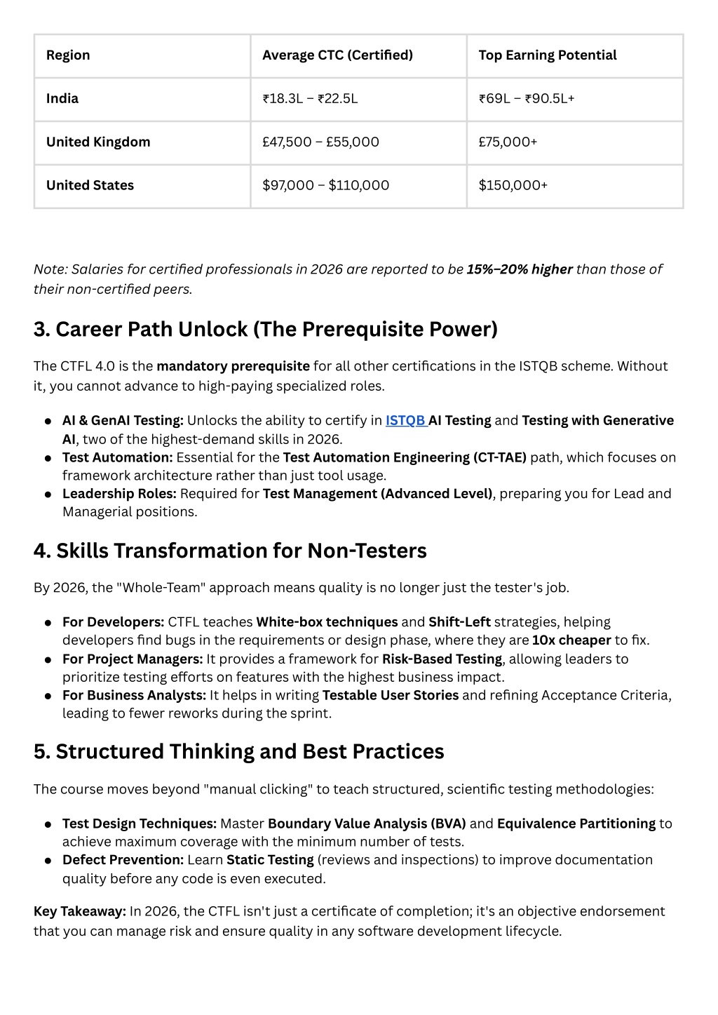 3. Region Average CTC (Certified) Top Earning Potential India ₹18.3L – ₹22.5L ₹69L – ₹90.5L+ United Kingdom £47,500 – £55,000 £75,000+ United States $97,000 – $110,000 $150,000+ Note: Salaries for certified professionals in 2026 are reported to be 15%–20% higher than those of their non-certified peers. 3. Career Path Unlock (The Prerequisite Power) The CTFL 4.0 is the mandatory prerequisite for all other certifications in the ISTQB scheme. Without it, you cannot advance to high-paying specialized roles. AI & GenAI Testing: Unlocks the ability to certify in ISTQB AI Testing and Testing with Generative AI, two of the highest-demand skills in 2026. Test Automation: Essential for the Test Automation Engineering (CT-TAE) path, which focuses on framework architecture rather than just tool usage. Leadership Roles: Required for Test Management (Advanced Level), preparing you for Lead and Managerial positions. 4. Skills Transformation for Non-Testers By 2026, the "Whole-Team" approach means quality is no longer just the tester's job. For Developers: CTFL teaches White-box techniques and Shift-Left strategies, helping developers find bugs in the requirements or design phase, where they are 10x cheaper to fix. For Project Managers: It provides a framework for Risk-Based Testing, allowing leaders to prioritize testing efforts on features with the highest business impact. For Business Analysts: It helps in writing Testable User Stories and refining Acceptance Criteria, leading to fewer reworks during the sprint. 5. Structured Thinking and Best Practices The course moves beyond "manual clicking" to teach structured, scientific testing methodologies: Test Design Techniques: Master Boundary Value Analysis (BVA) and Equivalence Partitioning to achieve maximum coverage with the minimum number of tests. Defect Prevention: Learn Static Testing (reviews and inspections) to improve documentation quality before any code is even executed. Key Takeaway: In 2026, the CTFL isn't just a certificate of completion; it's an objective endorsement that you can manage risk and ensure quality in any software development lifecycle.