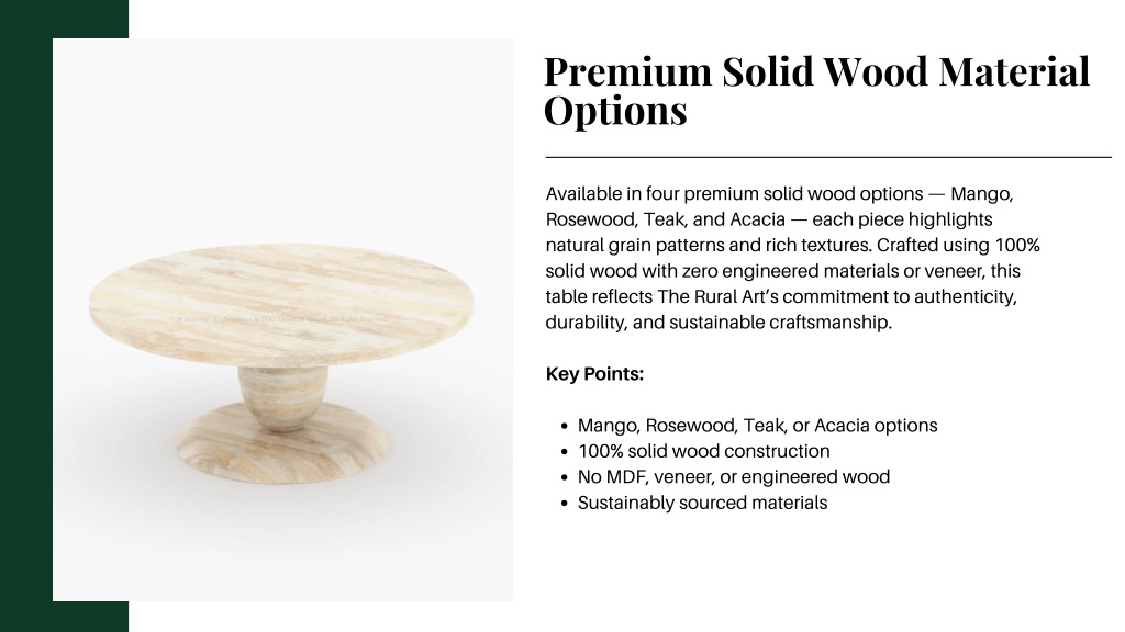Premium Solid Wood Material Options Available in four premium solid wood options — Mango, Rosewood, Teak, and Acacia — each piece highlights natural grain patterns and rich textures. Crafted using 100% solid wood with zero engineered materials or veneer, this table reflects The Rural Art’s commitment to authenticity, durability, and sustainable craftsmanship. Key Points: Mango, Rosewood, Teak, or Acacia options 100% solid wood construction No MDF, veneer, or engineered wood Sustainably sourced materials