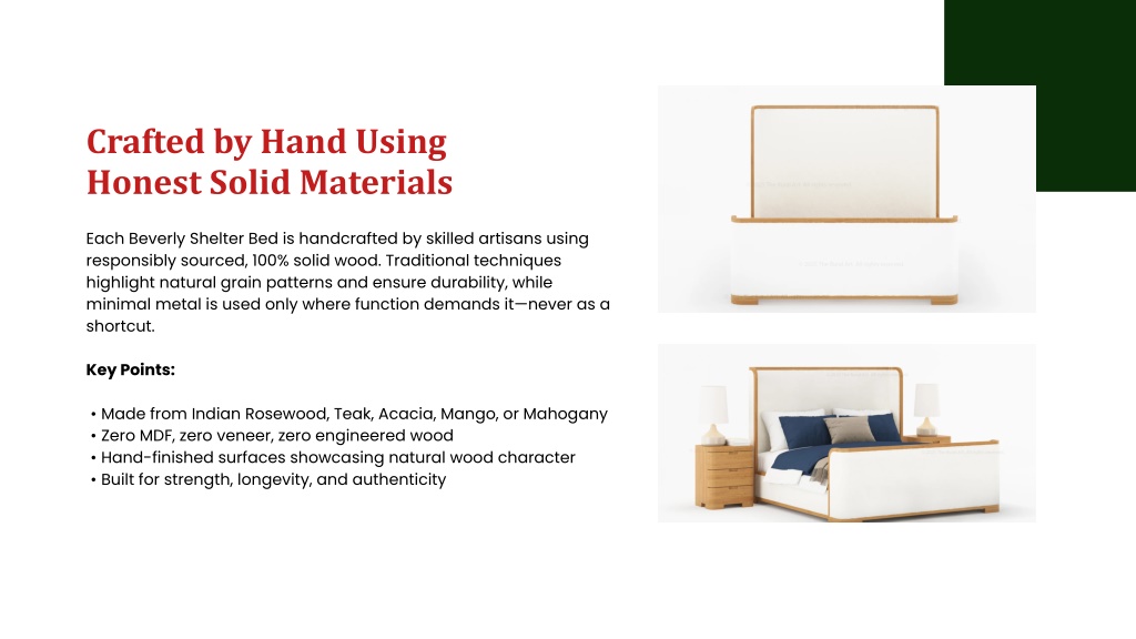 Crafted by Hand Using Honest Solid Materials Each Beverly Shelter Bed is handcrafted by skilled artisans using responsibly sourced, 100% solid wood. Traditional techniques highlight natural grain patterns and ensure durability, while minimal metal is used only where function demands it—never as a shortcut. Key Points: • Made from Indian Rosewood, Teak, Acacia, Mango, or Mahogany • Zero MDF, zero veneer, zero engineered wood • Hand-finished surfaces showcasing natural wood character • Built for strength, longevity, and authenticity