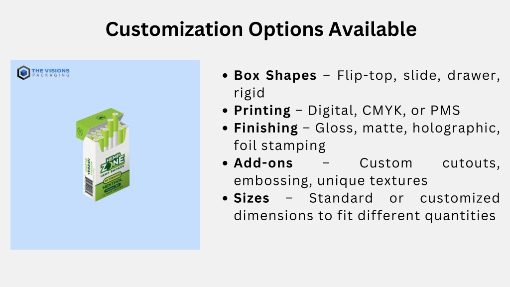 Conclusion Conclusion Custom cigarette boxes by The Visions Packaging are designed to protect your products, enhance shelf appeal, and communicate your brand story. From durable materials and luxury finishes to eco-friendly options and affordable wholesale rates, we provide packaging solutions that elevate your brand above the competition.