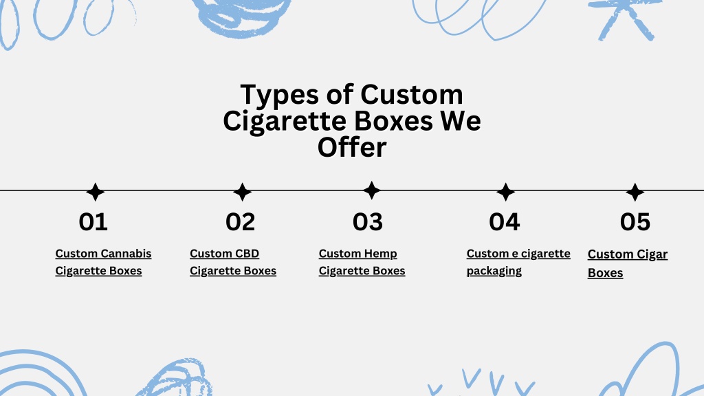 Types of Custom Types of Custom Cigarette Boxes We Cigarette Boxes We Offer Offer 01 02 03 04 05 Custom Cigar Boxes Custom Cannabis Cigarette Boxes Custom CBD Cigarette Boxes Custom Hemp Cigarette Boxes Custom e cigarette packaging