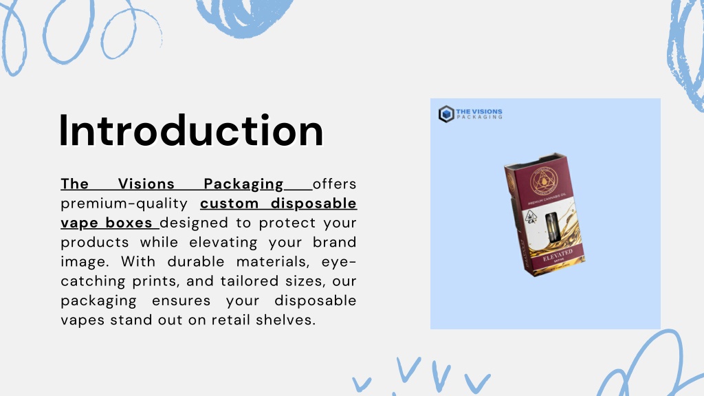 Introduction Introduction The premium-quality custom disposable vape boxes designed to protect your products while elevating your brand image. With durable materials, eye- catching prints, and tailored sizes, our packaging ensures your disposable vapes stand out on retail shelves. Visions Packaging offers