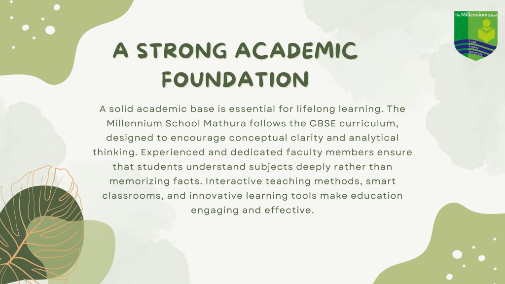 A STRONG ACADEMIC A STRONG ACADEMIC FOUNDATION FOUNDATION A solid academic base is essential for lifelong learning. The Millennium School Mathura follows the CBSE curriculum, designed to encourage conceptual clarity and analytical thinking. Experienced and dedicated faculty members ensure that students understand subjects deeply rather than memorizing facts. Interactive teaching methods, smart classrooms, and innovative learning tools make education engaging and effective.