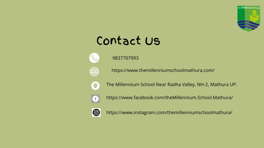 Contact Us 9837707993 https://www.themillenniumschoolmathura.com/ The Millennium School Near Radha Valley, NH-2, Mathura UP. https://www.facebook.com/theMillennium.School.Mathura/ https://www.instagram.com/themillenniumschoolmathura/