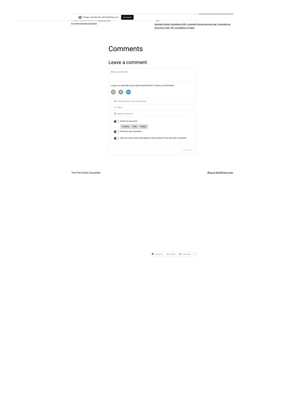 Design a site like this with WordPress.com Get started Posted February 3, 2024 in corporate tax by thefirstcheckconsultant Tags: Business Setup Consultants UAE, corporate finance services uae, Corporate tax services in UAE, VAT consultants in Dubai Comments Leave a comment Write a comment... Log in or provide your name and email to leave a comment. Email (Address never made public) Name Website (Optional) Email me new posts Instantly Daily Weekly Email me new comments Save my name, email, and website in this browser for the next time I comment. Comment Blog at WordPress.com. The First Check Consultant Comment Reblog Subscribe
