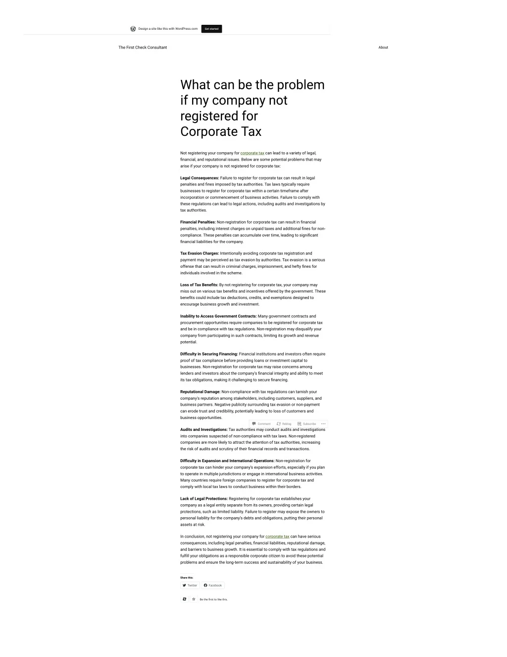 Design a site like this with WordPress.com Get started The First Check Consultant About What can be the problem if my company not registered for Corporate Tax Not registering your company for corporate tax can lead to a variety of legal, financial, and reputational issues. Below are some potential problems that may arise if your company is not registered for corporate tax: Legal Consequences: Failure to register for corporate tax can result in legal penalties and fines imposed by tax authorities. Tax laws typically require businesses to register for corporate tax within a certain timeframe after incorporation or commencement of business activities. Failure to comply with these regulations can lead to legal actions, including audits and investigations by tax authorities. Financial Penalties: Non-registration for corporate tax can result in financial penalties, including interest charges on unpaid taxes and additional fines for non- compliance. These penalties can accumulate over time, leading to significant financial liabilities for the company. Tax Evasion Charges: Intentionally avoiding corporate tax registration and payment may be perceived as tax evasion by authorities. Tax evasion is a serious offense that can result in criminal charges, imprisonment, and hefty fines for individuals involved in the scheme. Loss of Tax Benefits: By not registering for corporate tax, your company may miss out on various tax benefits and incentives offered by the government. These benefits could include tax deductions, credits, and exemptions designed to encourage business growth and investment. Inability to Access Government Contracts: Many government contracts and procurement opportunities require companies to be registered for corporate tax and be in compliance with tax regulations. Non-registration may disqualify your company from participating in such contracts, limiting its growth and revenue potential. Difficulty in Securing Financing: Financial institutions and investors often require proof of tax compliance before providing loans or investment capital to businesses. Non-registration for corporate tax may raise concerns among lenders and investors about the company’s financial integrity and ability to meet its tax obligations, making it challenging to secure financing. Reputational Damage: Non-compliance with tax regulations can tarnish your company’s reputation among stakeholders, including customers, suppliers, and business partners. Negative publicity surrounding tax evasion or non-payment can erode trust and credibility, potentially leading to loss of customers and business opportunities. Comment Reblog Subscribe Audits and Investigations: Tax authorities may conduct audits and investigations into companies suspected of non-compliance with tax laws. Non-registered companies are more likely to attract the attention of tax authorities, increasing the risk of audits and scrutiny of their financial records and transactions. Difficulty in Expansion and International Operations: Non-registration for corporate tax can hinder your company’s expansion efforts, especially if you plan to operate in multiple jurisdictions or engage in international business activities. Many countries require foreign companies to register for corporate tax and comply with local tax laws to conduct business within their borders. Lack of Legal Protections: Registering for corporate tax establishes your company as a legal entity separate from its owners, providing certain legal protections, such as limited liability. Failure to register may expose the owners to personal liability for the company’s debts and obligations, putting their personal assets at risk. In conclusion, not registering your company for corporate tax can have serious consequences, including legal penalties, financial liabilities, reputational damage, and barriers to business growth. It is essential to comply with tax regulations and fulfill your obligations as a responsible corporate citizen to avoid these potential problems and ensure the long-term success and sustainability of your business. Share this: Twitter Facebook Be the first to like this.