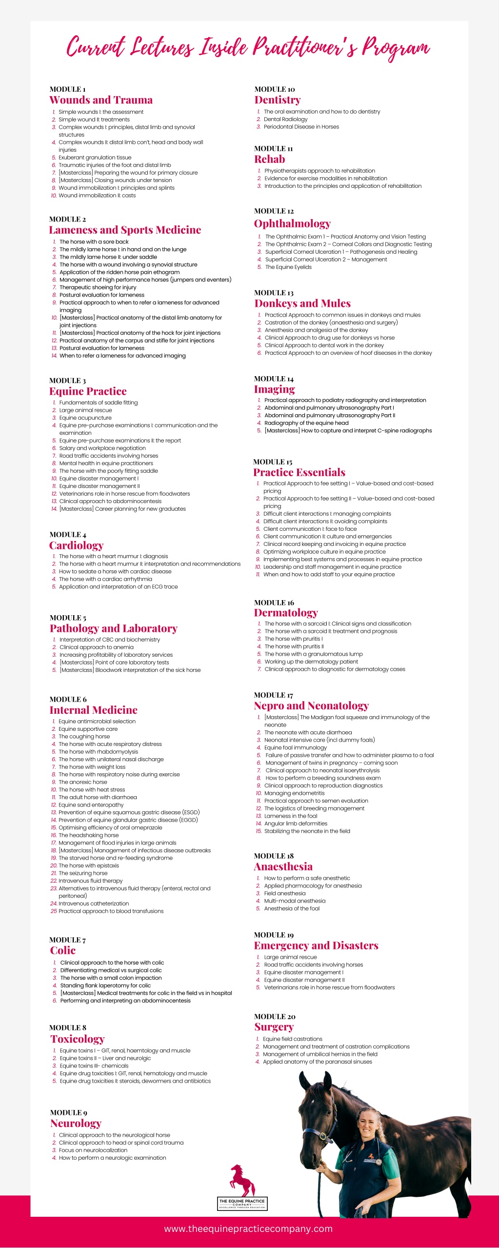 Explore the latest lectures in equine veterinary education, covering lameness, sports medicine, wound care, cardiology, internal medicine, and more. Download this PDF from The Equine Practice Company to enhance your equine practice skills. Learn more at https://www.theequinepracticecompany.com/