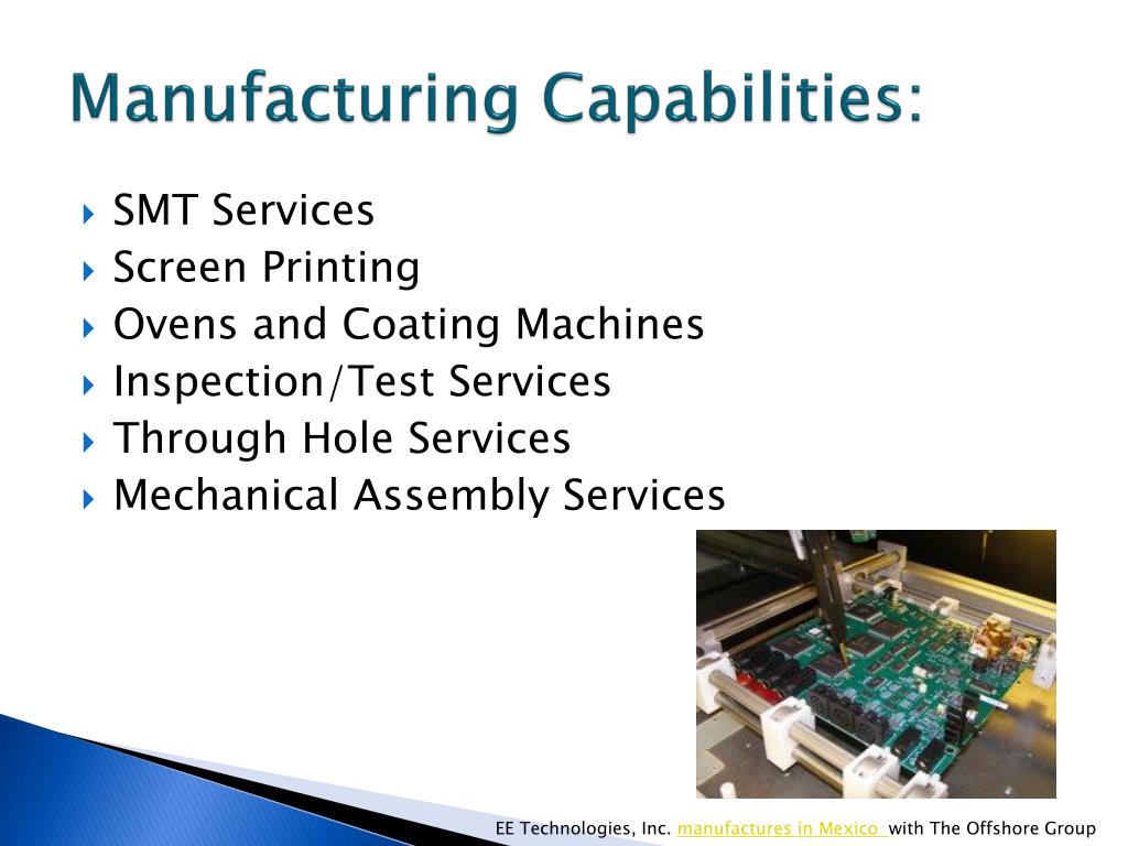 Manufacturing Capabilities: • SMT Services • Screen Printing • Ovens and Coating Machines • Inspection/Test Services • Through Hole Services • Mechanical Assembly Services EE Technologies, Inc. manufactures in Mexicowith The Offshore Group