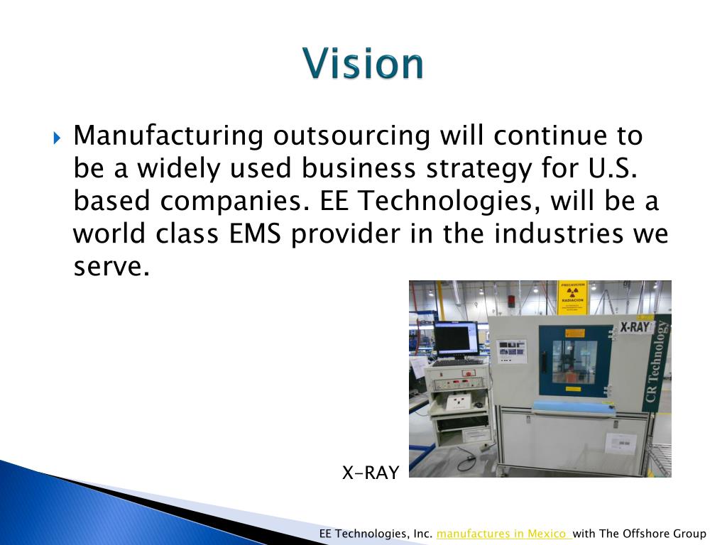 Vision • Manufacturing outsourcing will continue to be a widely used business strategy for U.S. based companies. EE Technologies, will be a world class EMS provider in the industries we serve. X-RAY EE Technologies, Inc. manufactures in Mexicowith The Offshore Group
