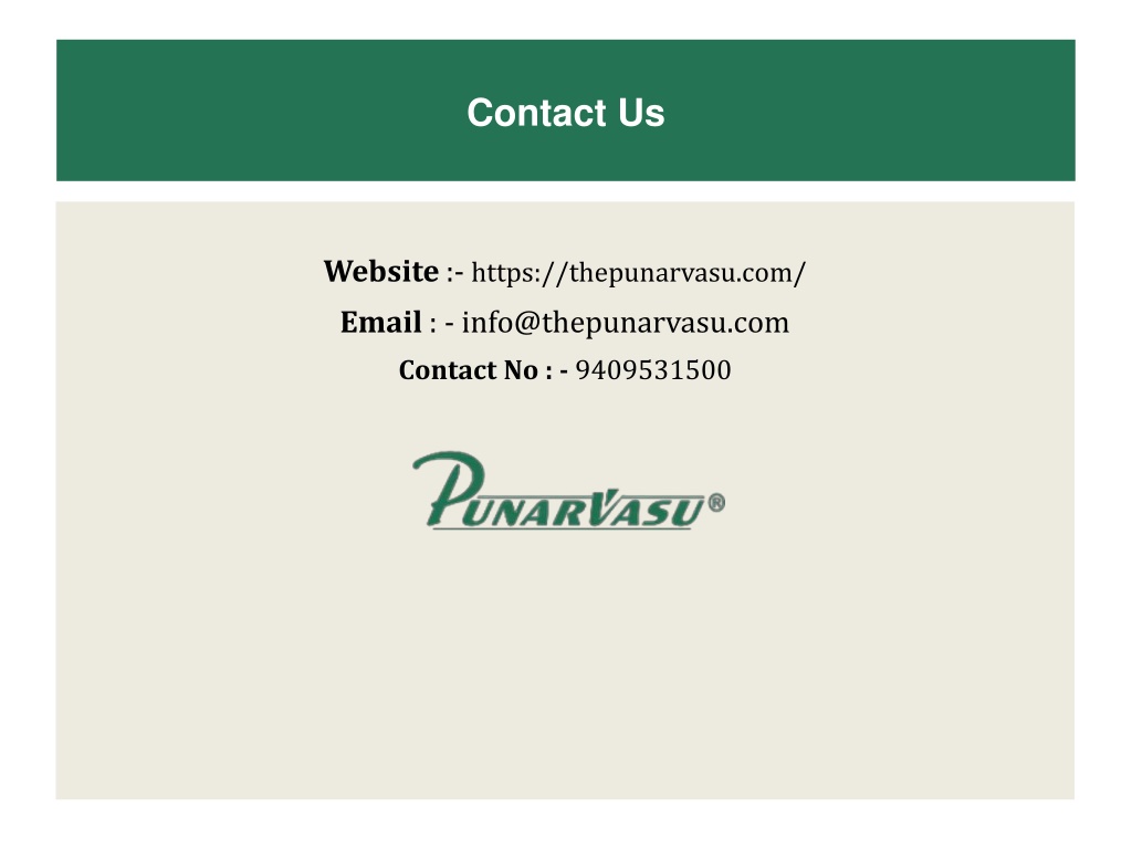 Contact Us Website :- https://thepunarvasu.com/ Email : - info@thepunarvasu.com Contact No : - 9409531500