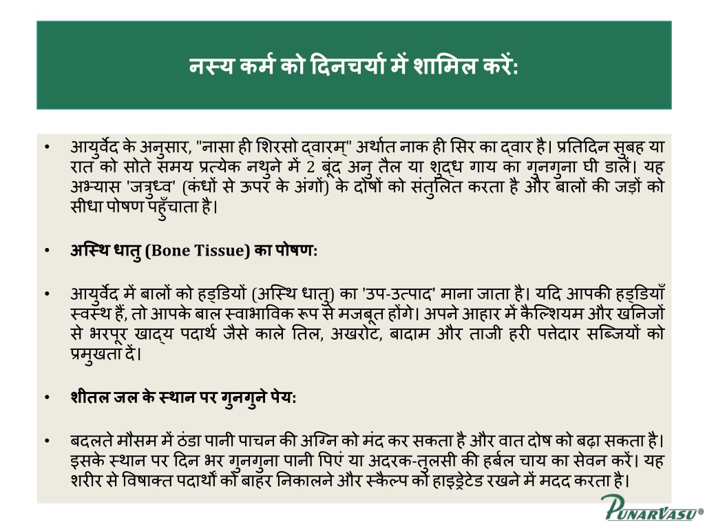 नस्यकर्मकोदिनचर्यामेंशामिलकरें:नस्यकर्मकोदिनचर्यामेंशामिलकरें: • आयुर्वेदकेअनुसार, "नासाहीशिरसोद्वारम्" अर्थातनाकहीसिरकाद्वारहै।प्रतिदिनसुबहयारातकोसोतेसमयप्रत्येकनथुनेमें 2 बूंदअनुतैलयाशुद्धगायकागुनगुनाघीडालें।यहअभ्यास 'जत्रुध्व' (कंधोंसेऊपरकेअंगों) केदोषोंकोसंतुलितकरताहैऔरबालोंकीजड़ोंकोसीधापोषणपहुँचाताहै। • अस्थिधातु (Bone Tissue) कापोषण: • आयुर्वेदमेंबालोंकोहड्डियों (अस्थिधातु) का 'उप-उत्पाद' मानाजाताहै।यदिआपकीहड्डियाँस्वस्थहैं, तोआपकेबालस्वाभाविकरूपसेमजबूतहोंगे।अपनेआहारमेंकैल्शियमऔरखनिजोंसेभरपूरखाद्यपदार्थजैसेकालेतिल, अखरोट, बादामऔरताजीहरीपत्तेदारसब्जियोंकोप्रमुखतादें। • शीतलजलकेस्थानपरगुनगुनेपेय: • बदलतेमौसममेंठंडापानीपाचनकीअग्निकोमंदकरसकताहैऔरवातदोषकोबढ़ासकताहै।इसकेस्थानपरदिनभरगुनगुनापानीपिएंयाअदरक-तुलसीकीहर्बलचायकासेवनकरें।यहशरीरसेविषाक्तपदार्थोंकोबाहरनिकालनेऔरस्कैल्पकोहाइड्रेटेडरखनेमेंमददकरताहै।
