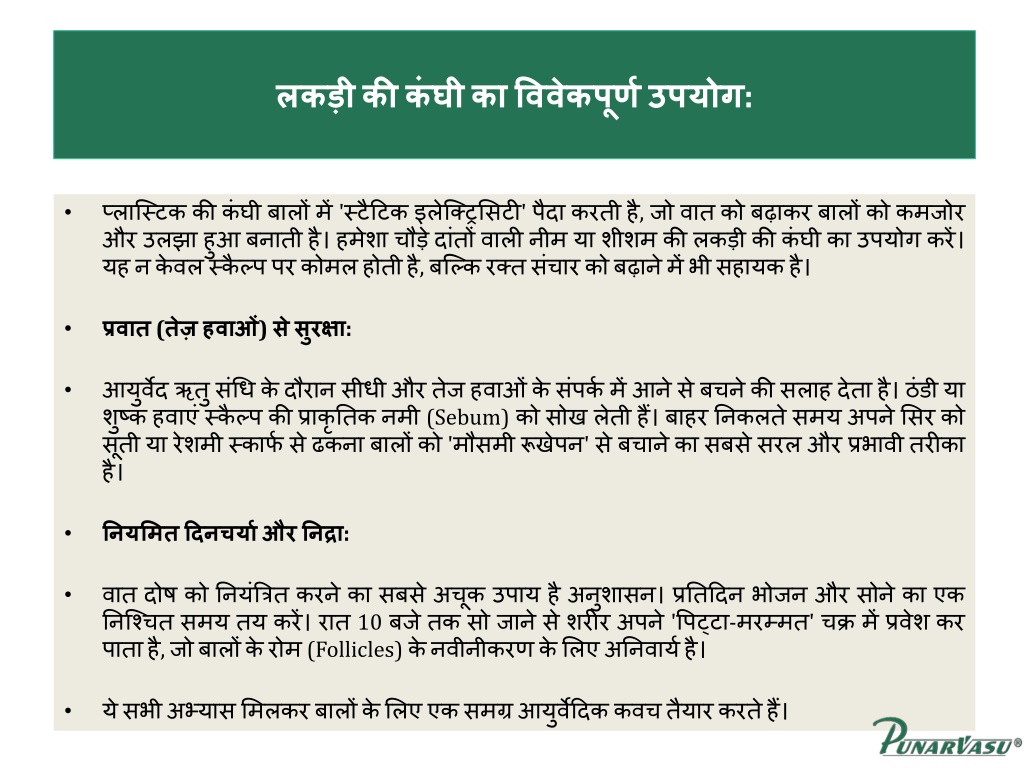 लकड़ीकीकंघीकाविवेकपूर्णउपयोग:लकड़ीकीकंघीकाविवेकपूर्णउपयोग: • प्लास्टिककीकंघीबालोंमें 'स्टैटिकइलेक्ट्रिसिटी' पैदाकरतीहै, जोवातकोबढ़ाकरबालोंकोकमजोरऔरउलझाहुआबनातीहै।हमेशाचौड़ेदांतोंवालीनीमयाशीशमकीलकड़ीकीकंघीकाउपयोगकरें।यहनकेवलस्कैल्पपरकोमलहोतीहै, बल्किरक्तसंचारकोबढ़ानेमेंभीसहायकहै। • प्रवात (तेज़हवाओं) सेसुरक्षा: • आयुर्वेदऋतुसंधिकेदौरानसीधीऔरतेजहवाओंकेसंपर्कमेंआनेसेबचनेकीसलाहदेताहै।ठंडीयाशुष्कहवाएंस्कैल्पकीप्राकृतिकनमी (Sebum) कोसोखलेतीहैं।बाहरनिकलतेसमयअपनेसिरकोसूतीयारेशमीस्कार्फसेढकनाबालोंको 'मौसमीरूखेपन' सेबचानेकासबसेसरलऔरप्रभावीतरीकाहै। • नियमितदिनचर्याऔरनिद्रा: • वातदोषकोनियंत्रितकरनेकासबसेअचूकउपायहैअनुशासन।प्रतिदिनभोजनऔरसोनेकाएकनिश्चितसमयतयकरें।रात 10 बजेतकसोजानेसेशरीरअपने 'पिट्टा-मरम्मत' चक्रमेंप्रवेशकरपाताहै, जोबालोंकेरोम (Follicles) केनवीनीकरणकेलिएअनिवार्यहै। • येसभीअभ्यासमिलकरबालोंकेलिएएकसमग्रआयुर्वेदिककवचतैयारकरतेहैं।